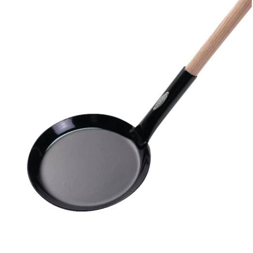 Pandekagepanden er produceret i emaljeret støbejern, som sikrer en lang levetid. Derudover kommer panden med et langt skaft 130 cm, der sikrer at både små og store ikke kommer for tæt på bålet. Skaftet kan deles i to, hvilket gør det nemt at opbevare eller transportere panderne.