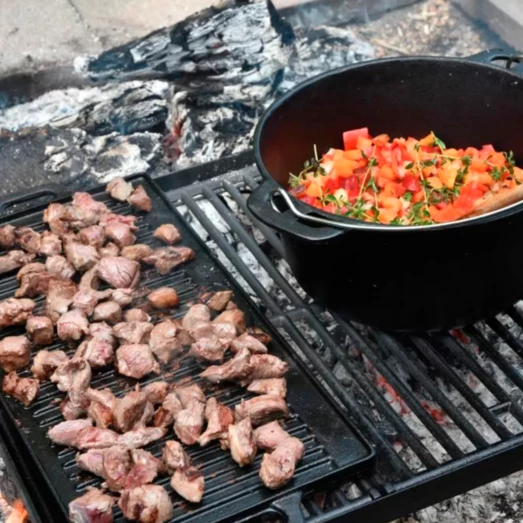 Lækkert støbejernssæt i praktisk opbevarings trækasse.