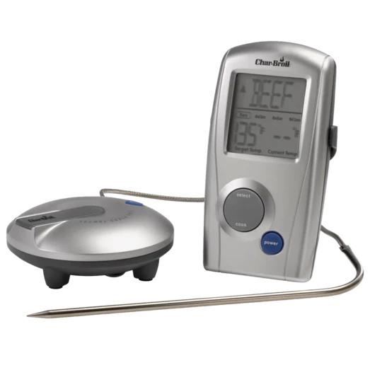 Trådløst stege termometer til batteri. Placere sonden i kødet og vælg den rigtige indstilling/tid på termometeret. Termometeret bipper, når maden er klar.
