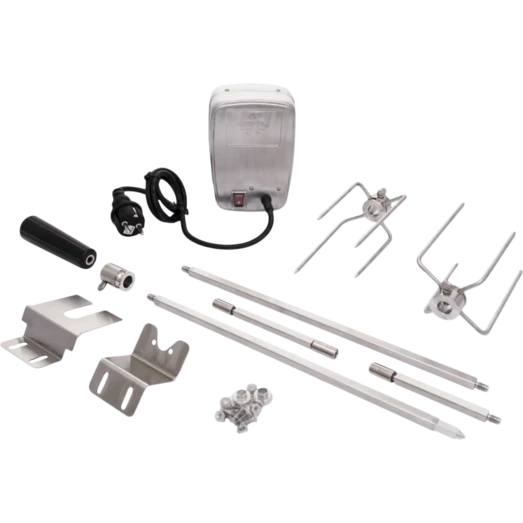 Komplet rotisserie med motor, beslag, 2 spidgafler samt spid. Sættet er u dført i kraftig kvalitet i rust frit stål. Passer på Platinum, Professional, Performance samt Gas2Coal. På Professional 4600 kan spiddet ikke nå gennem begge grill