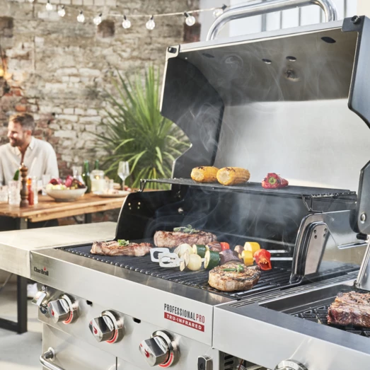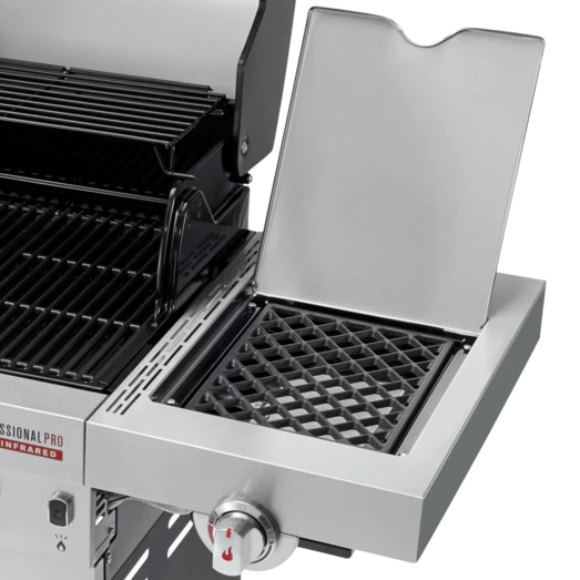 En højtydende Sear-burner, der når temperaturer op til 900° på brænderen, er monteret på siden. Sear-burneren perfektionerer den virkelig sprøde skorpe og giver flotte professionelle grillstriber. Grillen startes med elektronisk SureFire® tænding ved at du trykker på knappen, uden brug af tændstikker. Rent visuelt er Professional PRO ikke blot et ægte blikfang med sin eksklusive konstruktion i rustfrit stål, den har samtidig også mange praktiske ekstrafunktioner. Rødt LED-lys lyser, når du drejer på de forkromede drejeknapper. Det sørger ikke blot for et moderne design, men også for synlig kontrol over gastilførslen. En stor frontlåge af rustfrit stål, der er udstyret med kroge til grilltilbehør. Inde i grillen befinder sig en indbygget holder til gasflasken op til 11 kg samt ekstra opbevaringsplads. Takket være vores MADE2MATCH system, løftes niveauet for alsidighed og personlig tilpasning til nye højder. Med sine fire hjul kan grillen nemt skubbes hen til det ønskede sted, og de to bremser sikrer, at grillen bliver sikkert stående. Et manometer på regulatoren oplyser om, hvor meget der er tilbage i gasflasken. Ved hjælp af den indbyggede flaskeåbner kan du hurtigt åbne kølige drikkevarer. Det har aldrig været nemmere at grille!