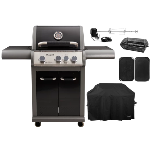 Til grillen medfølger ligeledes rotisseri 111 x 12 x 9 cm, der giver en lækker jævn tilberedning og er perfekt til grillning af kylling eller steg. Rotisserikurven 41 x 21,9 x 16,5 cm gør det nemt at tilberede tilbehør såsom, sprøde pommes frites til grill menuen. Grillbakke 49 x 27 cm der er perfekte til tilberedning af grønsager og med din non-stick belægning er du garanteret at maden ikke brænder fast og efterfølgende nem rengøring. Derudover kommer grillen med grillbetræk, så du sikrer grillen bedste beskyttelse mod vind og regn.
