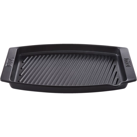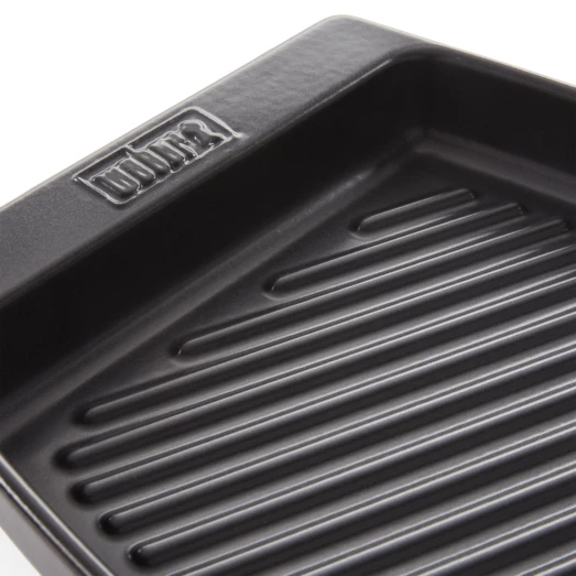 Weber grillpande er fremstillet i keramisk materiale, hvilket gør panden ridsefast og robust overfor maskinopvask. Pandens høje design gør det nemt at holde saften i pladen således at du er sikret en god sauce. Du kan anvende grillpanden til både gas, kul samt elgrill, og kan roligt smide den i opvaskemaskinen efter brug.