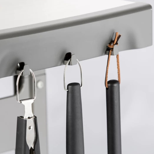 Grillens to sideborde udvider arbejdsområdet, mens dine grillredskaber kan hænges op på grillens seks redskabskroge.